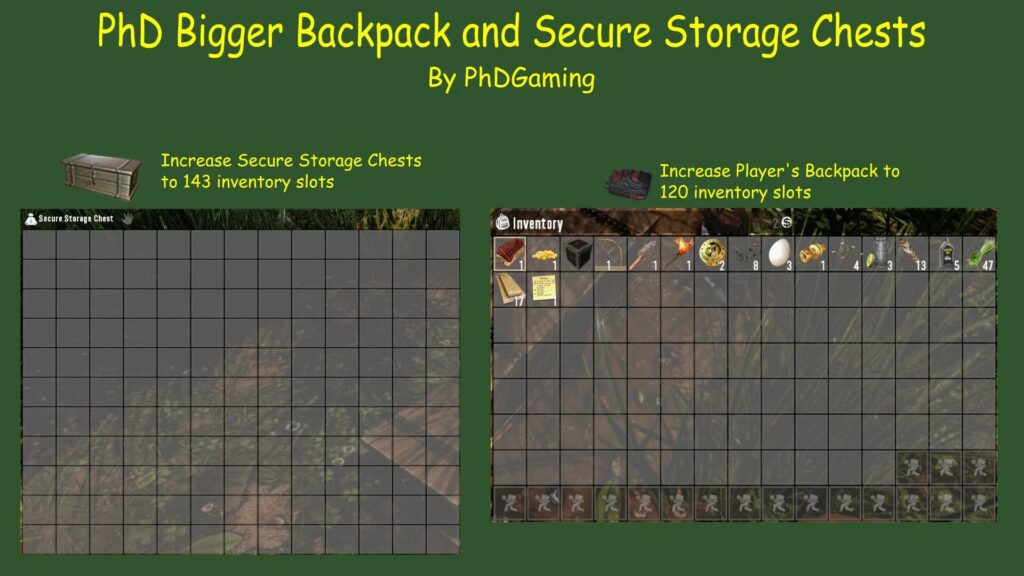 PhD Bigger Backpack and Secure Storage Chest (A21)は、『7 Days to Die(7DTD)』においてインベントリ容量と保管機能を拡張する利便性重視MODです。