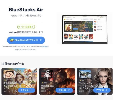 BlueStacksはスマートフォンゲームをパソコンの大画面で遊ぶために開発されたAndroidエミュレーターで、PC上に仮想的なAndroid環境を作り出すサービスです。