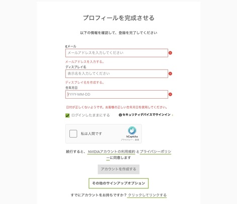 次のステップでは、NVIDIAアカウント本体の作成が必要です。