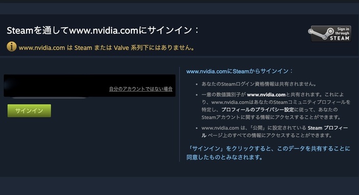 Steamのアカウントを使用して、https://www.nvidia.comにサインインしてください。