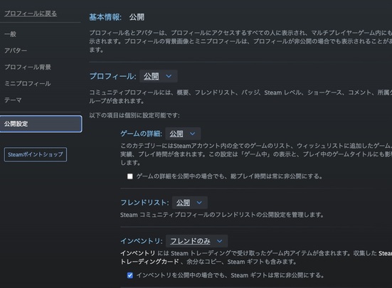 なお、ゲーム情報の同期を正常に行うためには、あらかじめSteamのプロフィール設定ページで「プロフィール公開設定」と「ゲーム詳細情報の公開設定」を有効にしておく必要があります。