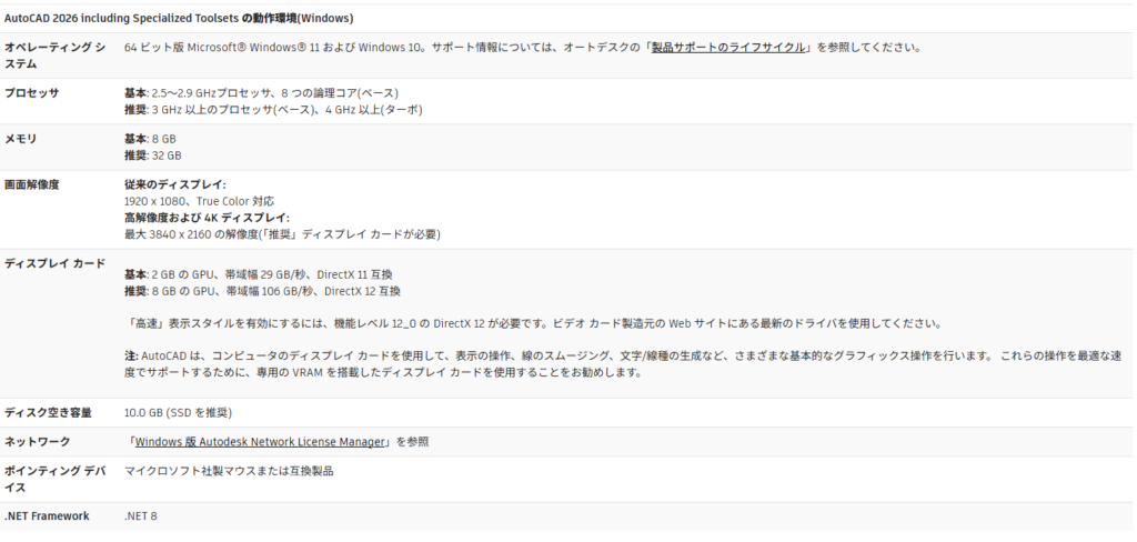 AutoCADを快適に利用するためには、上記環境が推奨されます。