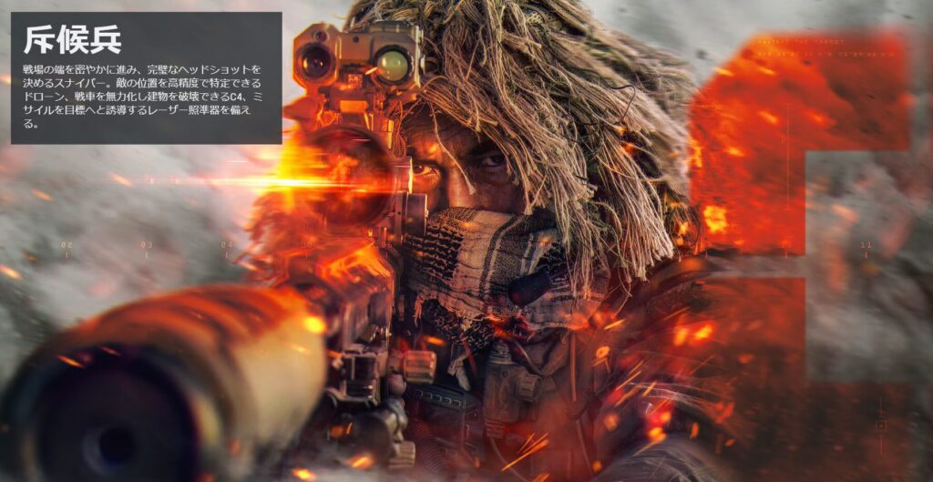 無人偵察機による敵部隊の位置特定や、長距離狙撃による敵兵排除など、情報収集と精密射撃を専門とする兵科です。