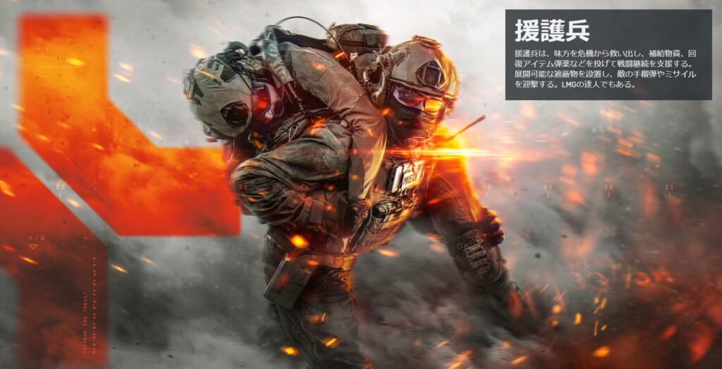 弾薬補給や医療支援を味方チームに提供し、部隊全体の継戦能力を向上させる後方支援型の兵科です。
