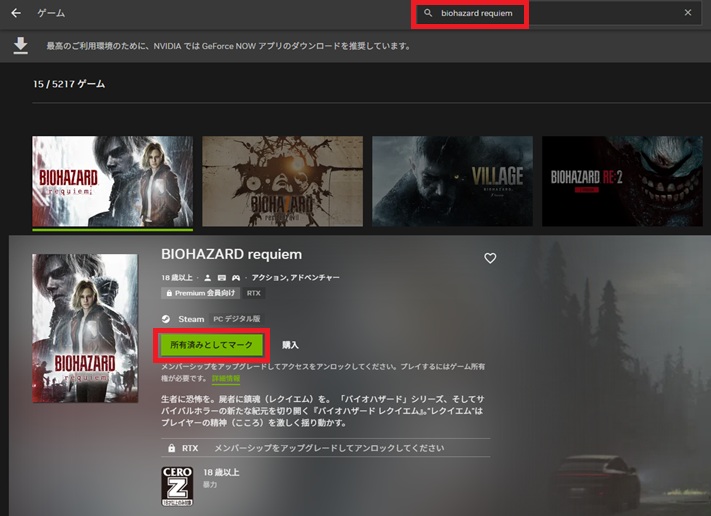 GeForce Nowアカウントにログインし、『biohazard requiem』と検索しましょう。