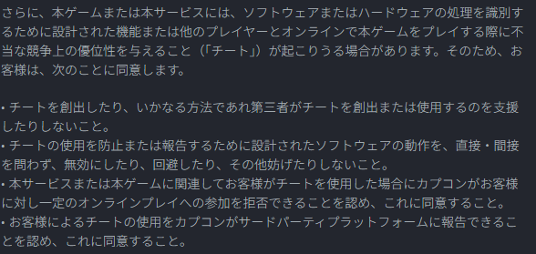 CAPCOMの規約では、未許可ツールやチートソフトの使用を明確に禁止しており、それらの利用者に対してはオンラインへの参加拒否・アカウントの利用停止・機能制限といった措置を取れると定められています。