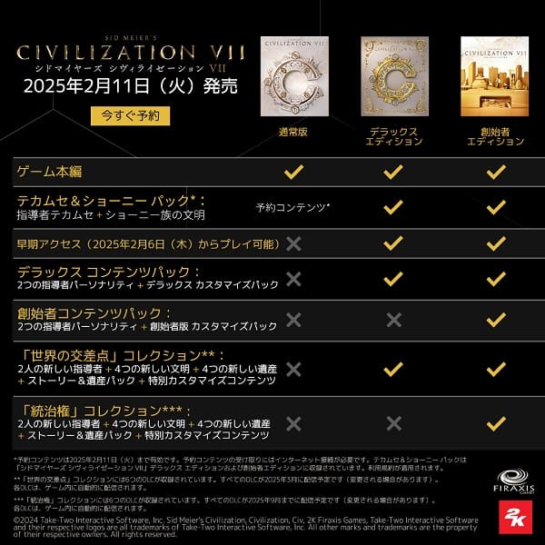 ゲーム内コンテンツについては、デラックスエディションで追加指導者や文明がすべて入手できます。創始者エディションは主にビジュアルカスタマイズ要素が追加される形となっています。