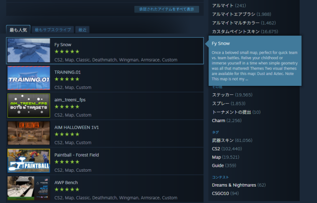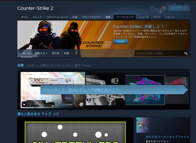 まずはSteamクライアントを開き、トップメニューの「コミュニティ」セクションから『Counter-Strike 2』のワークショップへ移動します。