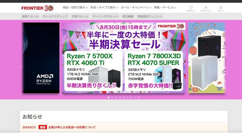フロンティアは、BTOパソコン業界で知られる人気ショップです。