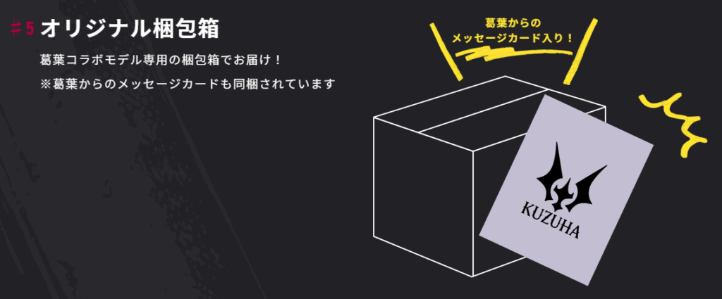 葛葉コラボモデル専用にデザインされた特別仕様の梱包箱での配送サービスが提供されます。