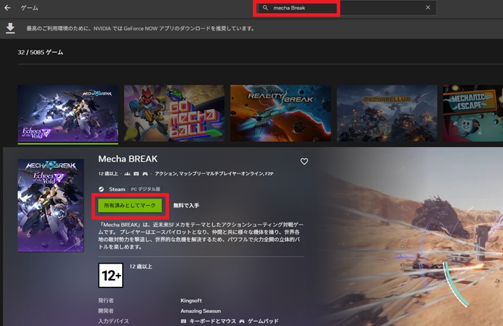 Mecha BREAKのゲームタイトルを選択し、「所有済みとしてマーク」という項目を選択してください。