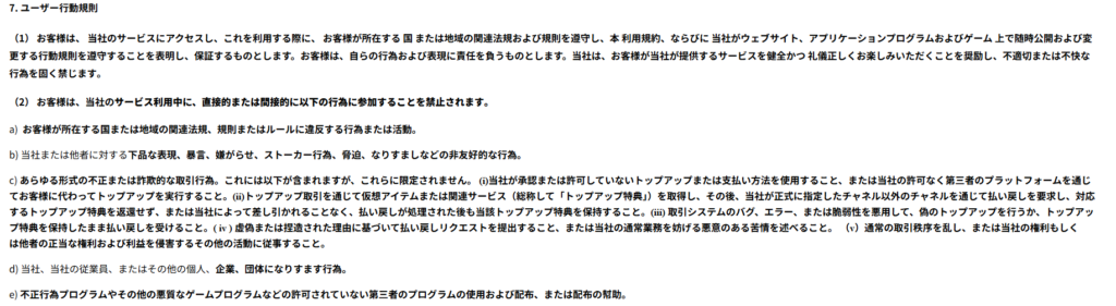公式利用規約の「7.(2)e」項には、チート等を含む未承認の第三者プログラムの使用および拡散が明確に禁止されている旨が記載されているためです。