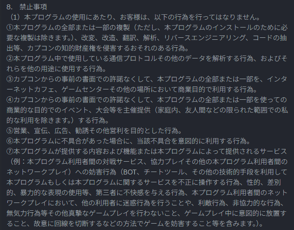 Capcomの利用規約には「改変・改造・解析」が禁止事項として明記されています。