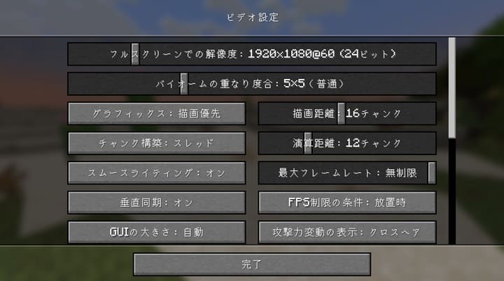 上記の設定に変更することで、マインクラフトのパフォーマンスが劇的に向上します。