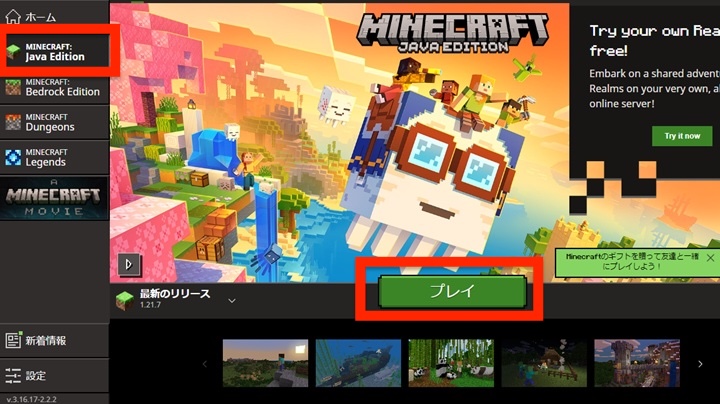 起動すると上記のような画面が表示されるので、「Java Edition」タブを選択して「プレイ」ボタンを押すと『マインクラフト』が開始されます。