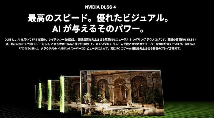 RTX5070をはじめとする、RTX50シリーズのグラフィックボードはNVIDIAが開発した最新の画像処理技術「DLSS4」に対応しています。