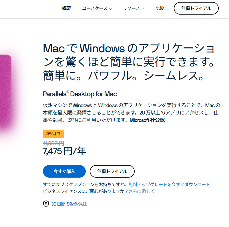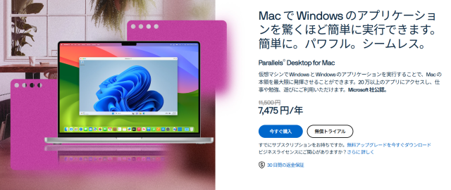初回利用の方は、Parallels Desktopの公式ウェブサイトより「無償トライアル」をクリックし、体験版をダウンロードしてください。