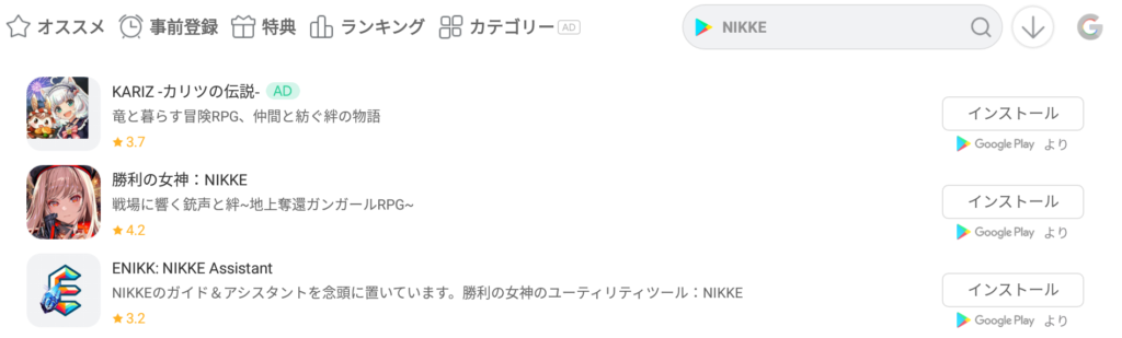 『勝利の女神:NIKKE』が検索結果に表示されるため、選択してインストールを行ってください。