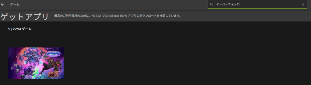 GeForce Nowアカウントでログイン後、『オーバーウォッチ』と検索すると、該当するゲームタイトルが表示されます。