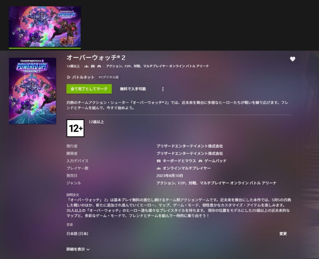 検索結果に表示された『オーバーウォッチ2』を選択し、「全て完了としてマーク」をクリックします。