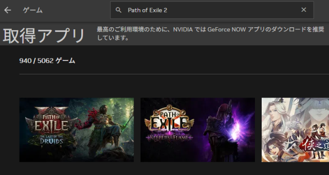 GeForce Nowのアカウントにログインしたら、検索バーに『Path of Exile 2』と入力して検索します。
