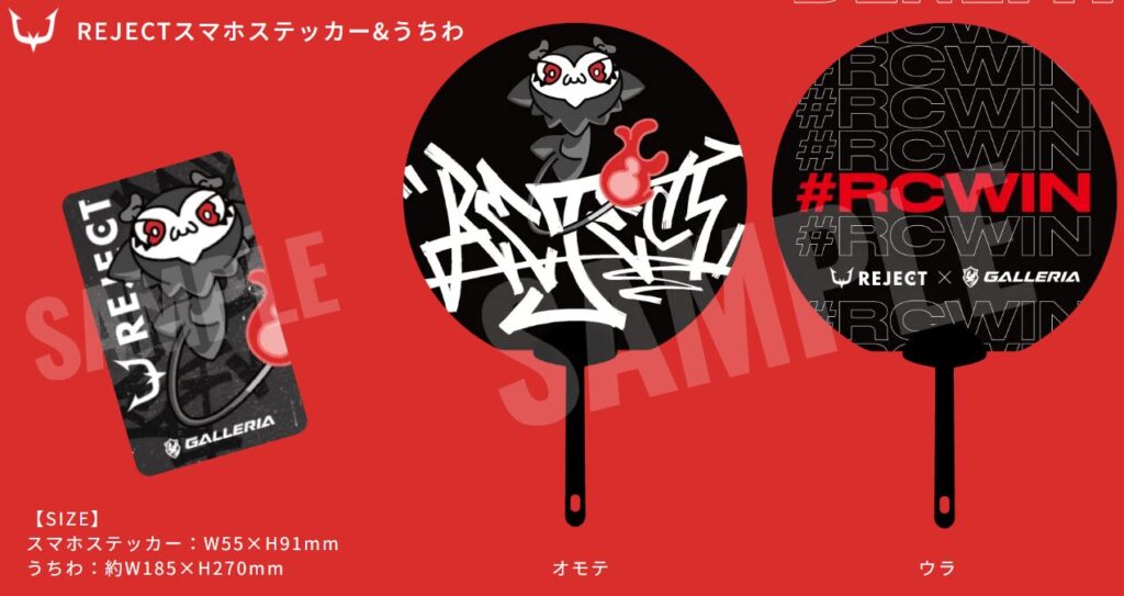スマートフォンケースに装着できるREJECTステッカーと、イベント会場やライブ配信の応援に使えるうちわが付属します。