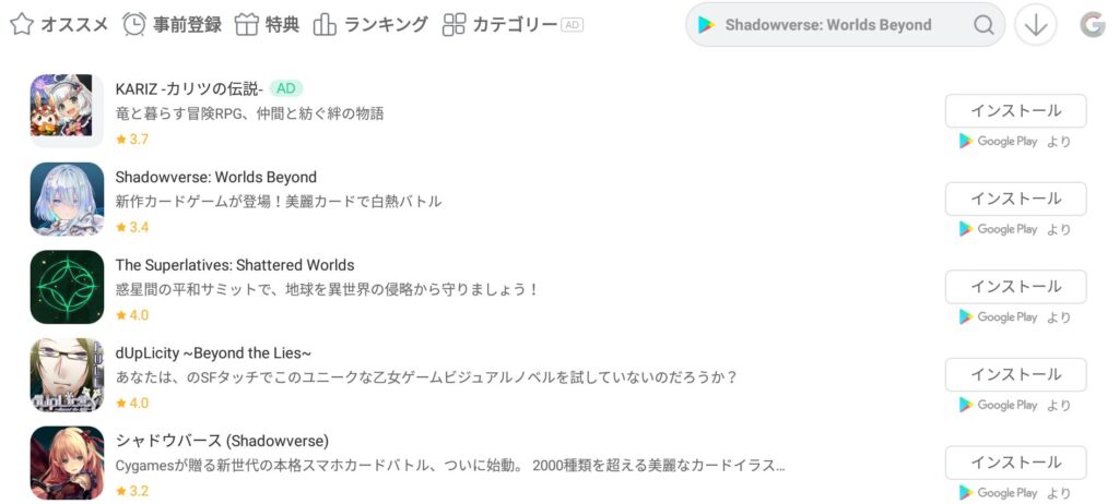 『シャドウバース ワールズビヨンド』が候補に出てくるので、選択してインストールしましょう。