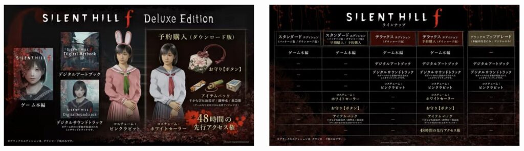 SILENT HILL fの通常版とデラックス版の相違点は、サウンドトラックとアートブック、そして追加コスチュームの有無のみとなっており、基本的なゲームプレイに関する差異はありません。
