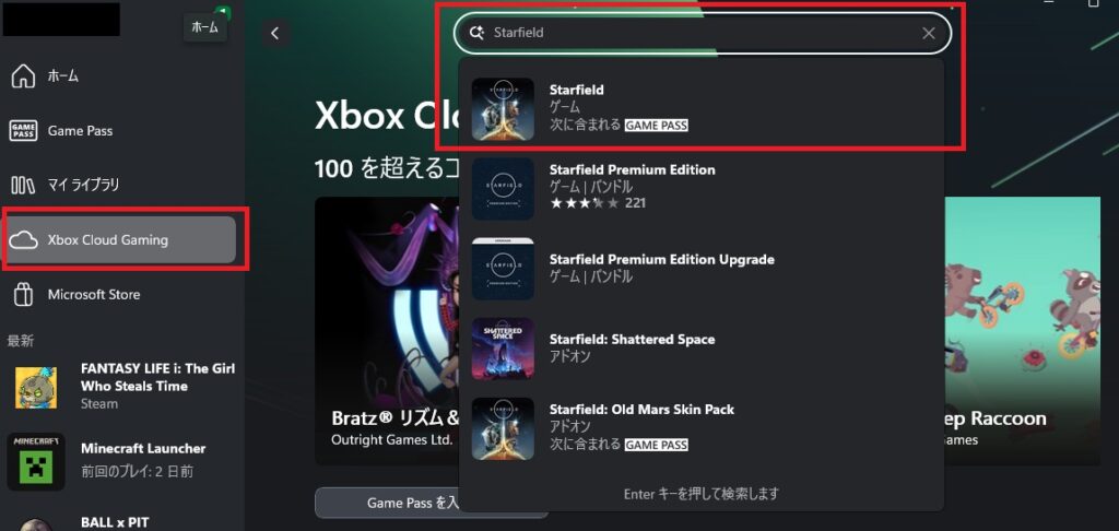 アプリケーションの「Xbox Cloud Gaming」タブを開き、検索欄に「Starfield」と入力して該当タイトルを選択します
