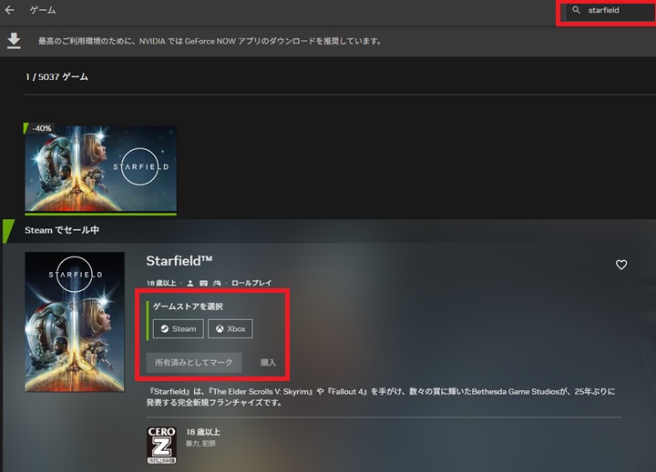 4. 検索結果に表示されたStarfieldを選択し、所有しているゲームストア(Steam または Xbox)を指定