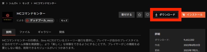 ダウンロード完了後、取得したMODファイルを『The Sims 4』のインストール先ディレクトリに配置、または既存ファイルとの置き換えを行うことでMODが動作します。