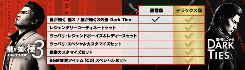 龍が如く 極3のデラックスエディションには、限定スキンや追加BGMなどのコンテンツが収録されています。