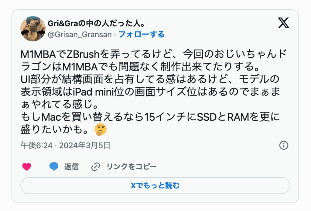 しかし、この構成では高密度のポリゴンを扱ったり、複雑なブラシ処理を行ったりする際には動作が不安定になりやすく、快適な制作環境とは言い難い点に留意しておく必要があります。